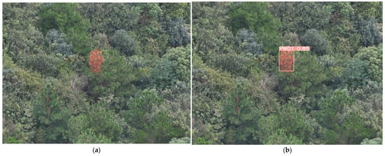 RGB images of PWD in pine trees were captured from a range of heights and distances using a drone (DJI Innovations Mavic Air 2). The dataset comprised different categories of infected pine trees, collectively referred to as pine wilt. Figure 2 provides a visual representation of the early and late stages of wilt symptoms.