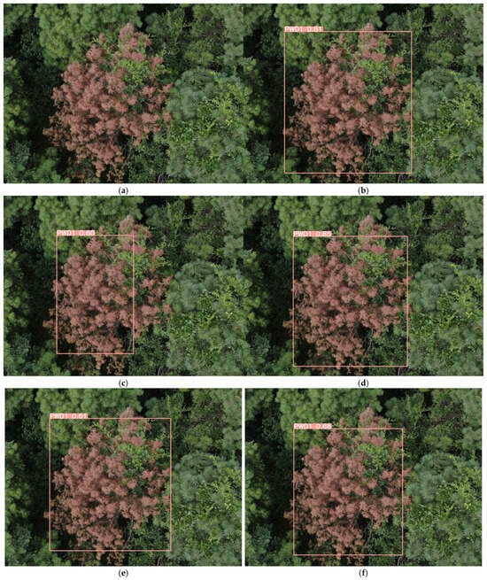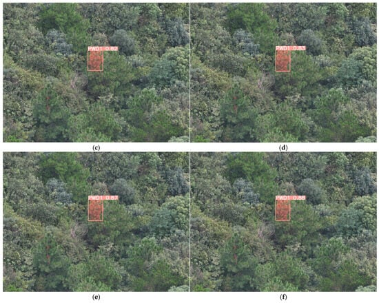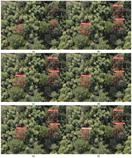 A comparative analysis of the efficacy of various models in detecting infected trees. (a) The origin image; (b) Base; (c) Base-SimAM; (d) Base-SE; (e) Base-BoT3; (f) Base-CBAM.