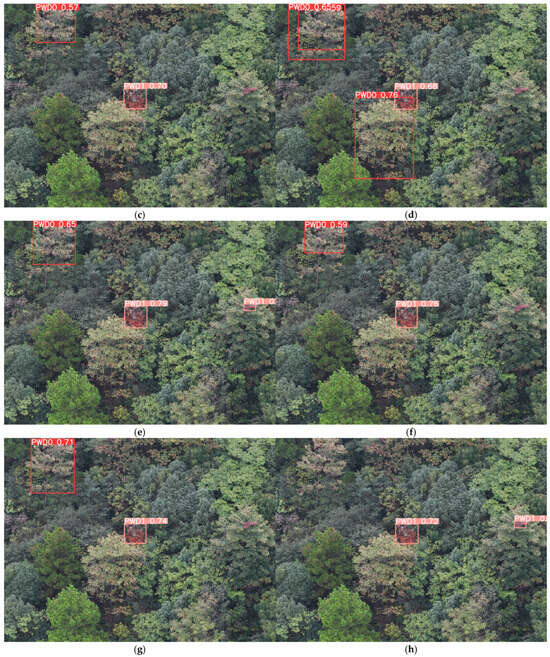 Comparing the performance of different models in detecting large-sized infected tree targets. (a) The origin image; (b) fusion model; (c) YOLOv3; (d) YOLOv5; (e) YOLOv6; (f) YOLOv7; (g) YOLOv8; (h) YOLOv9.