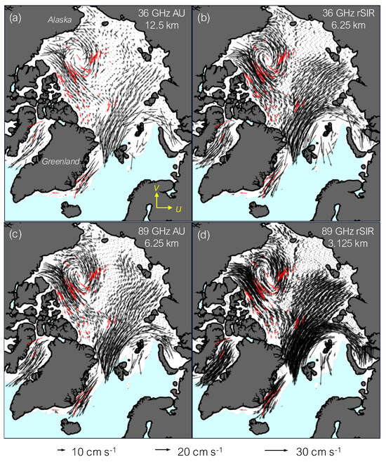 The rSIR maps have twice as many vectors at half the spacing as the standard resolution AU maps, so they show a more detailed and more defined motion pattern. For example, the center of the low in the Beaufort Sea is clearer and more structured in the rSIR fields. Of note, the 36 GHz rSIR TBs have the same gridded resolution as the 89 GHz AU TBs, so the two motion fields have the same density of estimates. However, the 36 GHz frequency is less affected by the atmosphere and can provide higher-quality motions. Thus, rSIR is able to provide the higher quality that 36 GHz delivers at a spatial resolution and density of coverage as the standard 89 GHz.