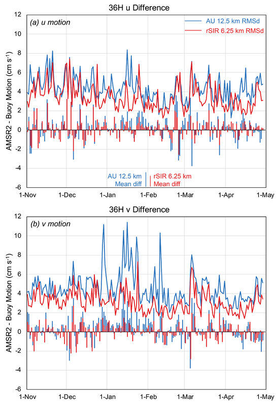 Next, the AMSR2 motions were compared to buoy motions to quantitatively evaluate and compare the rSIR and AU motions from 36 GHz and 89 GHz TBs. For the comparison, for each buoy, the closest AMSR2 estimate was selected with a maximum radius of 50 km. If there was no AMSR2 estimate within 50 km of a buoy, no comparison was made. Comparisons were made for each day for all available buoys for u and v components of motion relative to the EASE2 Grid (u motion in the x-direction, positive to the right; v motion in the y-direction, positive to the top). For each day of the study period, the AMSR2 minus buoy average difference and the RMS of the difference (RMSd) are calculated.