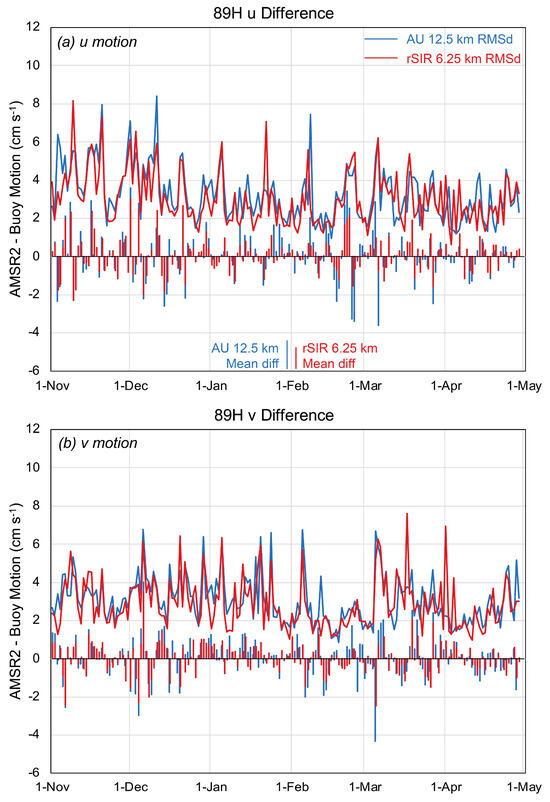As seen in the daily comparisons, there is much less improvement for the 89 GHz motions. This is not surprising because the sensor footprint of AMSR2 89 GHz (3 km × 5 km) is nearly the same as the rSIR gridded product (3.125 km). So, rSIR is not doing much resolution enhancement for 89 GHz TB. However, the rSIR method provides much more precise gridding than the simple drop-in-the-bucket method used for the AU product. So, the 89 GHz rSIR motions are still improved over the AU motions, but the improvement (5–10%) is smaller than for 36 GHz.