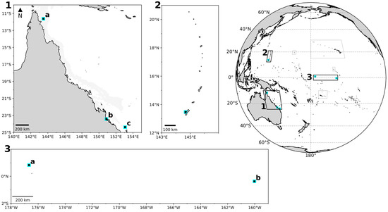 Coral reef regions within the FORE-C project: (1) the Great Barrier Reef (light grey indicates 4412 reef-containing pixels within the coordinate range of [140°E–155°E, 25°S–10°S]); (2) Guam and Northern Mariana Islands; (3) Howland (a) and Jarvis (b) Islands (noting the very sparse nature of reef locations). Locations where 5 km × 5 km pixel SST data are used in subsequent figures are highlighted (light-blue outline); letters (a,b,c) are provided to cross-reference specific pixels. The global map shows these and other FORE-C regions (grey boxes) from north to south as follows: Wake Atoll, the Hawaiian archipelago, and Johnston Atoll; Palmyra Atoll and Kingman Reef; and American Samoa (including Swains Island). The location of Baker Island (0.194°N, 176.477°W) is shown as a single dot in panel (3) just to the south of Howland Island (3a).