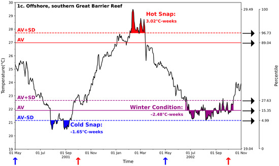 Hot Snap, Cold Snap, and Winter Condition metrics (°C-weeks) for a sample SST time-series extracted from a 5 km × 5 km reef pixel at 153°4′E, 24°22′S for the period from 01 May 2001 to 01 November 2002 (for the panel label, refer to Figure 1). The Hot Snap metric (area in red) accumulates when temperature exceeds the summer AV plus one summer SD (red dashed line). The Cold Snap metric (area in blue at left) accumulates when temperature drops below the winter AV minus one winter SD (bottom blue dashed line). The Winter Condition metric (area in purple at right) accumulates (1) within the three winter months (period of accumulation), and/or (2) when temperature is equal to or below the winter AV plus one winter SD (top purple dashed line). As the wintertime values combine with the subsequent summer conditions to predict disease risk [5], the Hot Snap of 3.02 °C-weeks and the Cold Snap of −1.65 °C-weeks predict disease outbreak risk in 2002, while the Winter Condition of −2.48 °C-weeks informs disease prediction for 2003. Red and blue arrows along the time axis indicate the summer reset month (i.e., October for Hot Snap) and the winter reset month (i.e., May for Cold Snap and Winter Condition), respectively; this is when each metric is initialised to 0 °C-weeks each year. The second axis (at right) illustrates the percentile value corresponding to each of the SST thresholds specified in this pixel.