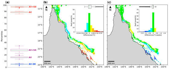Differences between the new percentile-based and existing AV- and SD-based thresholds (Figure 3b and Figure S1a,c) and the resultant metrics (Figure 3c and Figure S1b,d) are negligible for most of the GBR-containing pixels. The median differences (percentile—AV±SD) for the Hot Snap and Cold Snap thresholds were 0.00 °C, and for the Winter Condition threshold this was 0.01 °C. These led to correspondingly small differences in the median change to analysed metric values as follows: 0.00 °C-weeks for the 2001/2002 Hot Snap (R2 = 0.903; two-tailed paired t-test) and 2000/2001 Cold Snap (R2 = 0.862); −0.17 °C-weeks for the 2001/2002 Winter Condition (R2 = 0.811). For these events, 85% of the Hot Snap and 84% of the Cold Snap differences were in the range −0.45 to 0.45 °C-weeks, representing ±7.5% of the 6 °C-weeks range of values reported by Heron et al., 2010 [5]. For Winter Condition in that year, the differences were within −1.05 to 1.05 °C-weeks for 88% of reef pixels, which is ±3.3% of the previously reported range (32 °C-weeks [5]; see also Section 4.1).