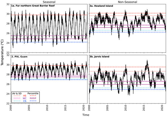 The study sites were within the specific coral reef regions of a NASA-funded project led by the University of Hawaii (FORE-C: Forecasting coral disease outbreaks across the tropical Pacific Ocean using satellite-derived data). Twelve reef areas (Figure 1) were assessed for this as follows: the Great Barrier Reef (GBR; Figure 1.1); Guam and the Northern Mariana Islands (NMI; Figure 1.2); Howland (Figure 1.3a) and Baker Islands; Jarvis Island (Figure 1.3b); Wake Atoll; the Hawaiian archipelago and Johnston Atoll; Palmyra Atoll and Kingman Reef; and American Samoa (including Swains Island). Here, we focus on four of those sites (GBR, Guam, Howland and Jarvis Islands) for the following reasons. The GBR (Figure 1.1) is the reef area where the existing AV- and SD-based metrics were originally developed [5], thus becoming the foundation for the new percentile-based approach. Guam (Figure 1.2) was included as a focus area to build upon previous work that revealed the limitations of the existing metrics in this weakly-seasonal region [10], benefiting from available disease data. Howland and Jarvis Islands (Figure 1.3) were chosen because they are located within a non-seasonal region, with some disease observation data available. To augment the analyses for the four focal regions, outcomes from other sites are available in Supplementary Materials.