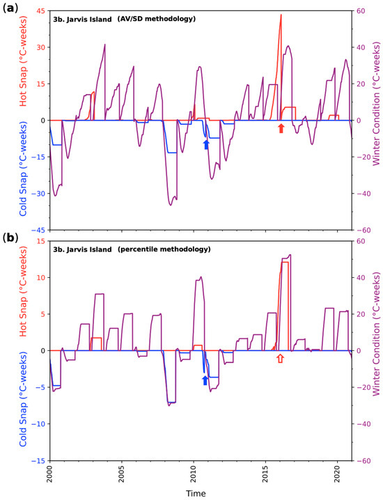 Time-series at Jarvis Island (2000–2020; panel labels refer to the pixel location in Figure 1.3b) of the (a) existing AV- and SD-based and the (b) new percentile-based Hot Snap (red), Cold Snap (blue) and Winter Condition (purple) metrics. Red and blue arrows indicate features referred to in the text.