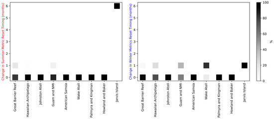 Change in the reset timing for the ‘summer’ (left) and ‘winter’ (right) metrics (absolute number of months) between the new percentile-based and existing AV- and SD-based methodologies at reef pixels (shown in Figure 1). The colour intensity indicates the percentage of pixels in a region with a certain difference. Analyses were conducted for the baseline period 1985–2005. Numbers of reef-containing pixels within each of the regions were: the Great Barrier Reef, 4412 pixels; the Hawaiian archipelago, 630 pixels; Johnston Atoll, 23 pixels; Guam and Northern Mariana Islands, 155 pixels; American Samoa, 56 pixels; Wake Atoll, 6 pixels; Palmyra Atoll and Kingman Reef, 18 pixels; Howland and Baker Islands, 12 pixels; and Jarvis Island, 2 pixels.