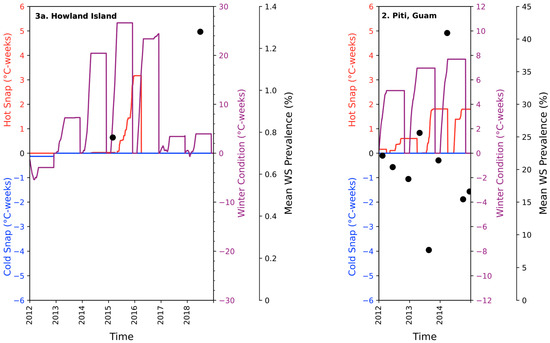 Time-series of the new percentile-based Hot Snap (red), Cold Snap (blue), and Winter Condition (purple) for (left) Howland Island, 2012–2018; and (right) Piti, Guam, 2012–2014 (for the panel labels, refer to Figure 1). Black dots indicate the observed mean prevalence of white syndrome.