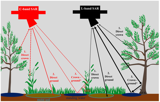 Depictions of generalized scattering mechanisms for C-band and L-band SAR when imaging wetlands. The primary types of radar scattering interactions that are modeled in MIMICS for a wetland system, ordered by increasing scattering coherence include direct crown (i.e., direct canopy) scattering (1), direct ground scattering (2), and crown–ground scattering (3). Double-bounce scattering includes both crown–ground and ground–crown scattering directions (* schematic depicts only crown–ground). A secondary scattering component modeled in MIMICS is the crown–ground–crown interaction (4) which is depicted by the dotted two-direction arrow near the crown–ground depiction. A generalization of SAR signal backscatter intensity is depicted by line thickness. Dashed lines depict volume scattering as opposed to surface or double-bounce scattering.