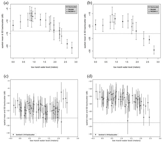 PALSAR/PALSAR-2 L-band HH (a) and HV (b) polarizations compared to Sentinel-1 C-band VV (c) and VH (d) polarizations (2016–2019) as a function of Wheeler Marsh tidal stage for low-mid elevation marsh region dominated by dense Spartina alterniflora (NWI class E2EM1P). Horizontal lines are positioned at the pixel inundation thresholds of −14.0 dB for co-polarizations and −23.0 dB for cross-polarizations. PALSAR imagery shows complete separability for the lowest and highest tide imagery in both co- and cross-polarizations. Backscatter distributions are +/−1 standard deviation (SD) for each point.