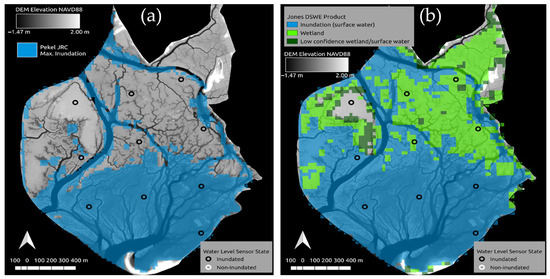 Optical inundation products derived from Landsat imagery over Wheeler Marsh at high tide (>=2.124 m). JRC maximum surface water extent computed over the Landsat 5–8 record (1985–2019) is shown in (a). Four out of ten water level sensors matched classified inundation from the JRC product. (b) The DWSE product derived from a single high–tide Landsat image from 1 December 2018. The DSWE product contains a more complex classification scheme than JRC in which 9/10 sensors corresponded to detected inundation as surface water or wetland classes.
