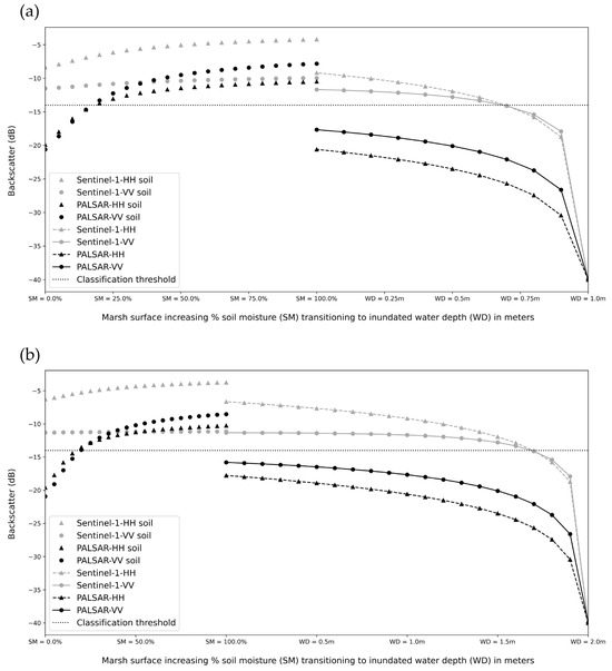 MIMICS simulated total backscatter response for L-band PALSAR and C-band Sentinel-1 for 1 m and 2 m vegetated marsh canopies during the growing season ((a,b), respectively). The horizontal dotted line depicts the location used in threshold-based classification in Equation (1).