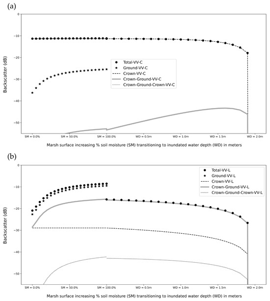 C-band (a) vs. L-band (b) VV backscatter contributions from different scattering mechanisms for a marsh with a 2 m canopy height. Note that decibel units sum non-linearly for total scattering.