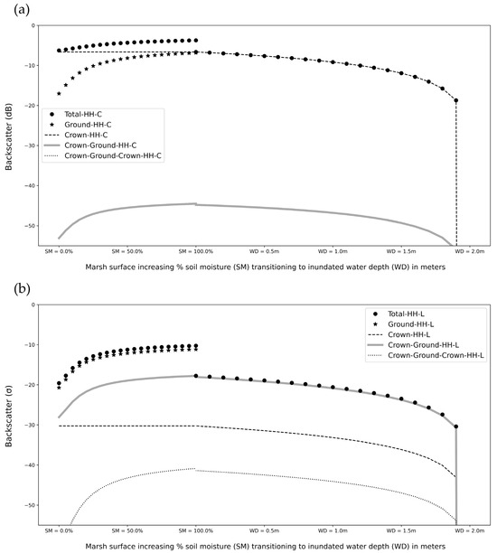 C-band (a) vs. L-band (b) HH backscatter contributions from different scattering mechanisms for a marsh with a 2 m canopy height. Note that decibel units sum non-linearly for total scattering.