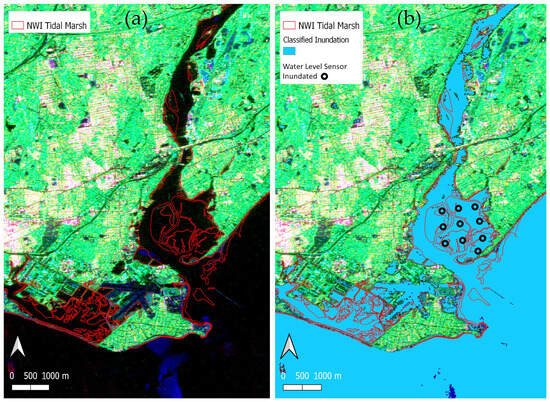 The accurate characterization of tidal wetland inundation patterns is of critical importance for understanding coastal hydrology, wetland carbon cycling, and biogeochemistry [1,2,3]. Tidal marsh–estuary interfaces have been described as hotspots for biogeochemical exchange [4,5,6]. Previous measurements in the Global Change Research Wetland (GCReW) and Blackwater National Wildlife Refuge (NWR) marsh-estuarine systems have shown that the amount of marsh-exported dissolved organic carbon (DOC) is mediated primarily by differences in tidal height and tidal range rather than seasonal variation in biological processes [7]. Measurements of marsh-exported DOC at the GCReW marsh showed a negative correlation with water depth at low tide (n = 29, r = −0.75), reflecting the extent to which marsh soil porewater (i.e., shallow groundwater) is exported into tidal creeks—a process that is most rapid during the lowest tides. Since low-low tides are often linked to high-high tides, this relationship also reflects the influence of marsh inundation extent in terms of exchange between surface water and marsh soils. Tidal inundation dynamics are expected to shift in response to sea-level rise (SLR), leading to coastal marshes being more inundated [8,9,10]. Because of the important role that inundation patterns play in mediating carbon exchange and other biogeochemical processes in coastal ecosystems, and considering shifts in ecosystem function and habitat associated with SLR, it is critical to develop accurate monitoring systems for tidal marshes.