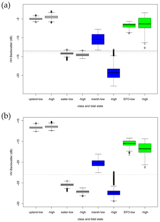 Blackwater NWR cover class PALSAR-2 backscatter distributions for HH (a) and HV (b) polarizations for low tide and tide images from Figure 11. These cover classes were previously established in Lamb et al. (2019) [45] from a combination of ground surveys and aerial imagery and include upland forest, open water, tidal marsh, and estuarine forested wetlands (EFO). For the HH polarization, a threshold of −13.5 dB established for PALSAR imagery in Lamb et al. (2019) [45] is depicted as a black dashed line. The classification thresholds established in this publication of −14 dB for HH and −23 dB for HV are depicted as grey lines indicating good consistency with the findings from Wheeler Marsh.