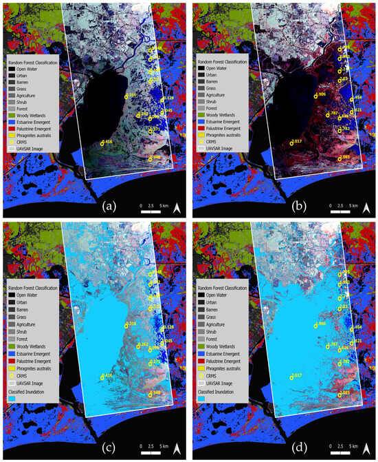 Sabine River low tide (panels (a,c)) and high tide (panels (b,d)) UAVSAR imagery obtained on 12 August 2019 (tidal stage 0.497 m) and 23 September 2019 (tidal stage 0.939 m), respectively, showing van Zyl decompositions (a,b) and overlaid backscatter-threshold inundation classifications (c,d). Decompositions scaled between −4 to −20 dB for surface scattering (blue) and double-bounce (red), −10 to −26 for volume scattering (green). The southern Sabine River region is dominated by both palustrine and estuarine marshes, as indicated by the random forest cover classification [46] expanding beyond the UAVSAR swath. CRMS water level values are expressed in feet.