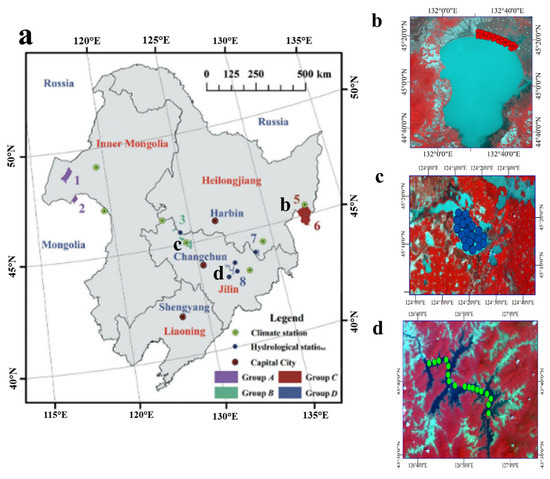 (a) Geographical locations of Xingkai Lake, Songhua Lake, and Chagan Lake. (b) Distribution of sampling points in Xingkai Lake. (c) Distribution of sampling points in Songhua Lake. (d) Distribution of sampling points in Chagan Lake.
