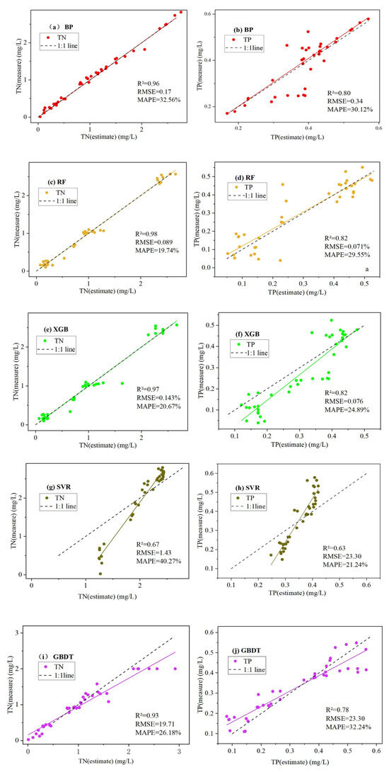 In the course of this research, we used machine learning (ML) algorithms to construct models for estimating TN and TP concentrations in different lakes. Five commonly used machine learning models were compared, including Extreme Gradient Boosting (XGBoost), Support Vector Regression (SVR), Backpropagation Neural Network (BP), Gradient Boosting Decision Tree (GBDT), and Random Forest (RF). Model development is a key step in effectively utilizing remote sensing data to estimate the concentrations of TN and TP in lakes [40,41,42,43,44].