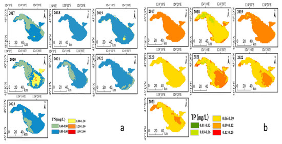 Utilizing the previously discussed Random Forest (RF) model, the inversion results for TN and TP concentrations were computed. Subsequently, the layout in spatial terms of changes in TN and TP levels in Xingkai Lake (refer to Figure 4) and Chagan Lake (refer to Figure 5) were mapped for the period from May 2017 to October 2023. The findings revealed substantial spatial and interannual variability across all lakes.