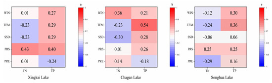 The situation in Chagan Lake is generally similar to that in Xingkai Lake (refer to Figure 8). However, Songhua Lake differs slightly due to its greater depth, which limits the sunlight’s impact on plant photosynthesis. Therefore, there is no significant correlation between SSD and TN or TP concentrations in this lake (refer to Figure 9). PRS shows a weak positive correlation with TN and TP concentrations (r = 0.25, p < 0.01 for both), potentially due to changes in air pressure affecting temperature through adiabatic processes, weather systems, and atmospheric stability mechanisms, thereby impacting phytoplankton growth and TN and TP concentrations [53,54].