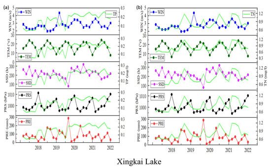 Distribution of TP concentration (a), TN concentration (b), and climate factors in Xingkai Lake.