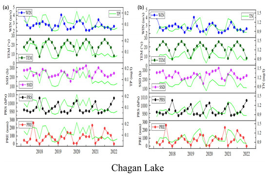 Distribution of TP concentration (a), TN concentration (b), and climate factors in Chagan Lake.