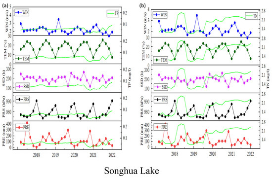 Distribution of TP concentration (a), TN concentration (b), and climatic factors in Songhua Lake.