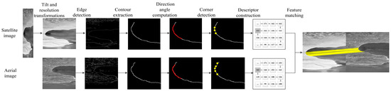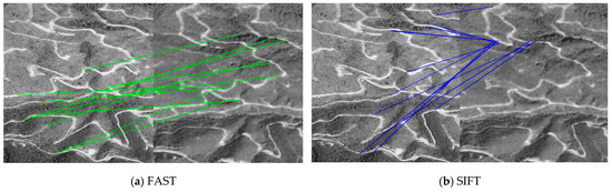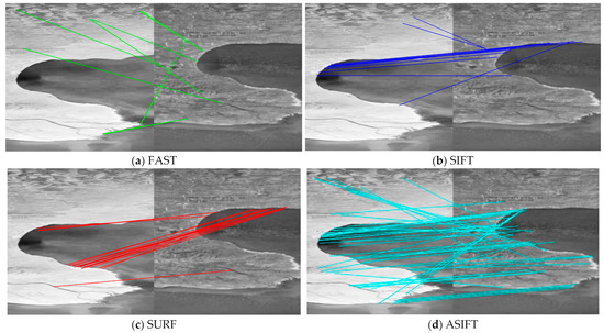 Point feature matching belongs to the category of feature-driven image matching methods [10,11]. Lowe [12] proposed the SIFT operator, which is invariant to scale, rotation, and illumination change. The SIFT algorithm is implemented in the Gaussian difference pyramid to achieve keypoints detection, and then feature matching is achieved by computing the gradient distribution around the keypoints [13]. Considering the feature points detection speed, Bay and others put forward the SURF [14] method. The SURF operator is obtained by searching the extreme value of determinant of Hessian in scale space, and the concepts of integral images and box filters are used in the process of feature detection. The Harris operator [15] is computed by Taylor’s formula, which makes the operator insensitive to illumination change. The Fast operator [16] is proposed based on machine learning and carries out feature points matching by constructing a decision tree. The BRIEF operator [17] needs to detect the feature points with the help of other matching operators, and binary strings are used as an efficient feature point descriptor. The ORB operator [18] detects the feature points using the FAST algorithm and then describes the feature points using the improved BRIEF operator. Yu and Morel [19] proposed the ASIFT operator with affine invariance. The ASIFT algorithm abstracts the viewpoint changes caused by camera and scene motion into a simplified spatial imaging model. It transforms the perspective of the image at different azimuth and pitch angles, and then feature matching is carried out using the SIFT operator. The ASIFT method is more effective in matching images under large viewpoint changes. Point feature matching is easily affected by noise and low contrast, and it is less effective for long-distance remote sensing images.