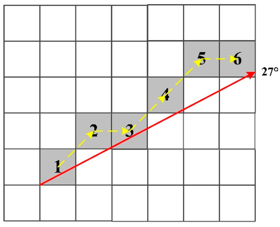 The direction angle between two pixels is defined based on the relative position of the eight neighboring pixels with respect to a given pixel, as shown in Figure 2. Define the direction as , the direction as , the direction as , the direction as , the direction as or , the direction as , the direction as , and the direction as . The specific angle value of the direction is given by the definition below.