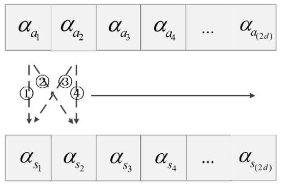 The feature point description vector of the aerial image is denoted as and the feature point description vector of the satellite image is denoted as . The comparison process between the description vectors is shown in Figure 5. We mark the index of the element in as and the index of the element in as . We mark the vector storing the index of the matched aerial direction angles as and the vector storing the index of the matched satellite direction angles as . We initialize and to 1, and complete a round of comparison in the order of step ① to step ④. If is smaller than a threshold in a certain step, we add to and to , and then and are increased by 1 at the same time and enter the next round of comparison. Otherwise, and are increased by 1 and go directly to the next round of the comparison. The comparison terminates when or reaches .