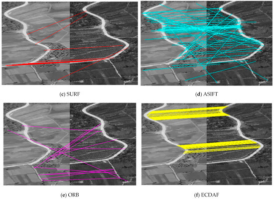 For the farmland scene, there are few changes in the gray value distribution of the same region in satellite images and aerial images, so the matching effect of the SIFT and SURF algorithms is improved. The effect of the FAST and ORB algorithms is still poor, and the matching effect of the ASIFT algorithm is still acceptable. The structural features of roads in farmland are stable, and the proposed algorithm is more effective.
