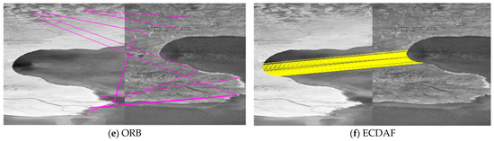 For the lake scene, the imaging time and imaging sensors of the satellite image and aerial image are different, and the gray value distribution of the same region are different. Therefore, the matching effects of the FAST, SIFT, SURF, and ORB algorithms are unsatisfactory. The large difference in the distribution of gray values in the same region between the satellite image and the aerial image also leads to the matching effect of the ASIFT algorithm being obviously not as good as that of the previous three scenarios. The proposed algorithm extracts the stable edge features of the lake and then performs image matching, achieving a better matching effect.