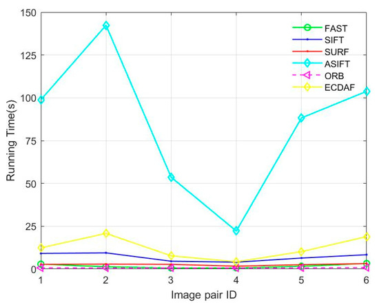 The running time of the FAST, SURF, and ORB algorithms are all relatively short, and for the six scenes, the running time is less than 4 s. The running time of the SIFT algorithm is a little longer than that of the above three algorithms, and for the six scenes, the running time is less than 10 s. The running time of the proposed ECDAF algorithm is ranked second among all the six matching algorithms, and for the six scenes, the running times are 12.37 s, 20.81 s, 7.72 s, 4.19 s, 10.15 s, and 18.92 s, respectively. The texture of the lake scene is the simplest and the proposed algorithm extracts the fewest edges, resulting in the shortest running time of the six scenarios. The ASIFT algorithm has the longest running time for the six scenes, and the running time is significantly longer than the other five matching algorithms. The running time statistics of the matching algorithms are shown in Figure 13.