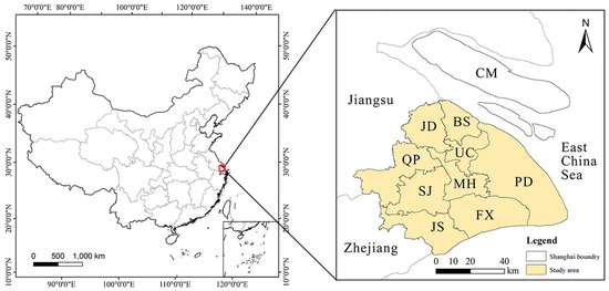 Shanghai, situated in the Yangtze River Delta of East China, spans a total land area of 6340.5 km2. The city is flanked by the East China Sea to the east and the mouth of the Yangtze River to the north and is bordered by the Zhejiang and Jiangsu provinces to the west. It rests on an alluvial plain that features a dense network of waterways, which amounts to a density of 3.38 km/km2 [42]. The region is approximately 2.19 m above sea level on average and is characterized by several low hills. Over the past decades, Shanghai has undergone significant urbanization, leading to substantial alterations in its landscape and a marked increase in total urban land area [6,27,43]. The rapid growth has been accompanied by a marked increase in population and a GDP of almost CNY 4.47 trillion (nearly US $620.23 billion) [44]. Thus, quantifying the future spatiotemporal dynamics of urban development in Shanghai is crucial for understanding the impacts of urbanization, informing effective urban planning, and guiding policy decisions. This research focuses on the mainland of Shanghai, excluding Chongming island (CM), and encompasses seven districts within the urban center (UC) area and eight districts in the suburban and exurban regions: Minhang (MH), Baoshan (BS), Jiading (JD), Pudong New Area (PD), Fengxian (FX), Jinshan (JS), Qingpu (QP), and Songjiang (SJ) (Figure 1).