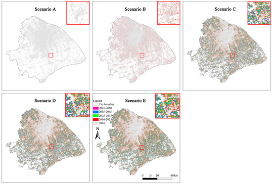 Spatially, the projected urban land growth from 2016 to 2060 varied significantly across four out of the five scenarios, except Scenario A (Figure 4). In Scenario A, there was minimal growth and change in urban land. Scenario B saw moderate urban expansion to the north. Scenarios C, D, and E displayed more extensive urban growth, with urbanization spreading in all directions across Shanghai. The net increase in urban land areas for each scenario was as follows: 8.6 km2 for Scenario A, 316.0 km2 for Scenario B, 1616.2 km2 for Scenario C, 1773.8 km2 for Scenario D, and 1876.1 km2 for Scenario E. These results demonstrated that the looser the protection measures, the greater the increase in urban land area.