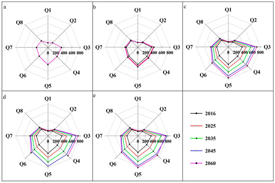 Urban land area changes across the eight quadrants of mainland Shanghai from 2016 to 2060 (a, b, c, d, and e represent the changes in Scenarios A, B, C, D, and E, respectively). Q1 to Q8 represent the quadrants in numerical order.