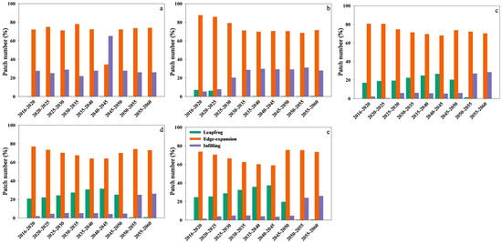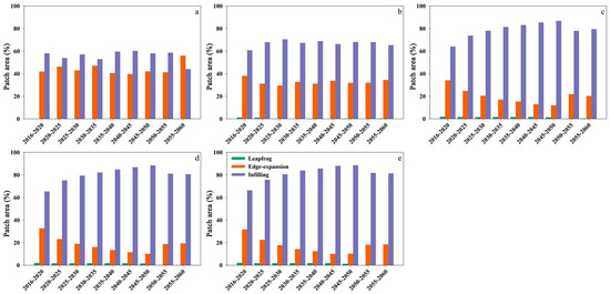 The proportions of newly grown patch area for the three urban growth modes in mainland Shanghai from 2016 to 2060 (a, b, c, d, and e represent the changes in Scenarios A, B, C, D, and E, respectively).