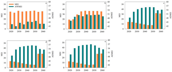 Temporal changes in the MEI and AWMEI of mainland Shanghai from 2016 to 2060 (a, b, c, d, and e represent the changes in Scenarios A, B, C, D, and E, respectively).