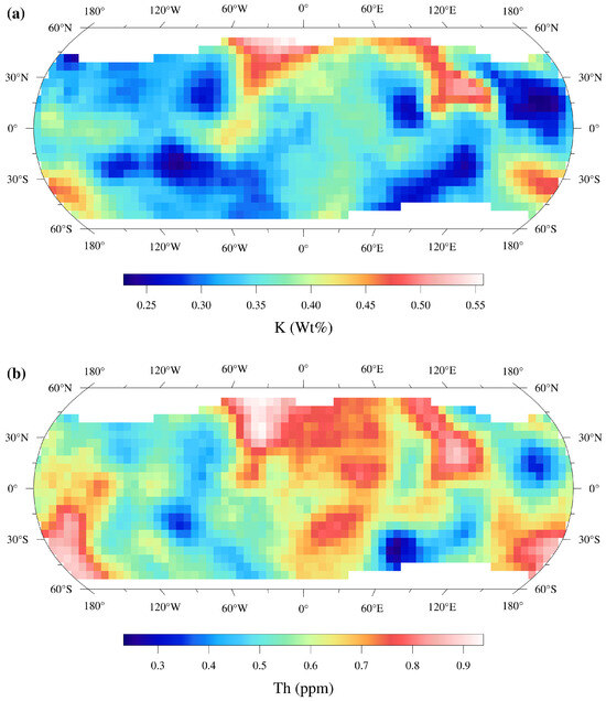 Global smoothed distribution maps of HPE abundances (K, Th and U) on Mars, illustrated with a 5° × 5° per pixel resolution. Base data of K and Th abundances are taken from Rani et al. [39], and the U abundance is calculated from a Th/U ratio of 3.8 [40,51].
