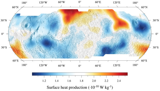 The total surface heat production of Mars is the sum of the heat contributions from all HPEs. We calculated the heat production of each radioactive isotope from the standard decay constants in Van Schmus [52] as a function of age. Because the Martian crust is usually considered strongly mixed by cratering [43], we used the observed local HPE abundances to calculate local crustal heat production. For 3.7 Ga, we obtain that H varied from 1.0 × W to 2.5 × W across the planet, with an average value of 1.7 × W (Figure 3).