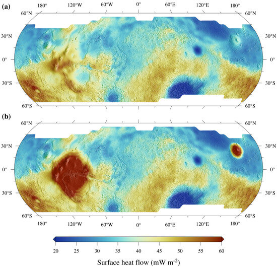 As the first step in proposing a global heat flow model for Mars at 3.7 Ga, we construct a model following the methodology of Parro et al. [36], which scales crustal thickness variations to heat flow variations through radioactive heat production. This first model still does not take into account the possible influence of the plume activity related to Noachian volcanism. We assume local HPEs are distributed in a HPE-rich upper layer (denoted by ) and no HPEs exist in the lowermost crust. It can be seen that a of 0.8b is consistent with non-negative mantle heat flows in all the thrust fault locations considered in Table 1, which is also consistent with previous studies [26,62,63,64]. Thus, we assume = 0.8b and modify the scaling procedure by Parro et al. [36] to account for the differentiated crust and local heat production rates. Thus, the local heat flow is given by