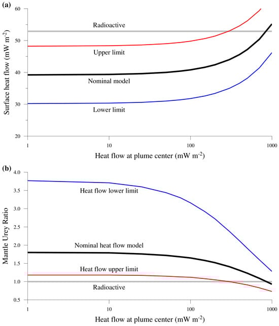 For < 1, the mantle as a whole is cooling down or heating up when > 1. The total radioactive heat production of Mars is not well-known. Thus, we calculated the total radioactive heat power of the mantle from the HPE abundances in the classical global compositional model by Wänke and Dreibus [75], based on the geochemistry of Martian meteorites, and subtracted the crustal radioactive production for an average crust of 56.7 km in thickness, with HPEs distributed only in the upper 80% of its thickness. Due to the uncertainty in the average heat flow calculation, we use the total range obtained for the calculation of the Urey ratios. The total mantle heat loss is obtained from the average heat flow by subtracting the crustal heat flow component (note that mantle heat loss includes plume effects). Figure 5b shows this relationship with increasing mantle plume contributions, and again, it is observed that this additional mantle heat loss is not enough to be equal to the heat loss with the total radioactive heat power (i.e., > 1) for reasonable central plume heat flows. This indicates that Mars, at the Noachian–Hesperian boundary, internally produced more heat through radioactivity than the heat it lost through its surface.