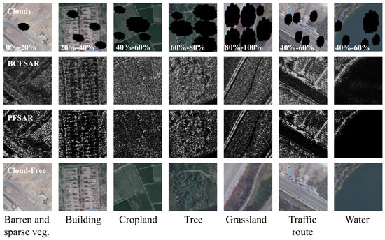 The AIR-POLSAR-CR1.0 dataset is a high-resolution multi-source dataset constructed from aerial optical data and PolSAR images. Specifically, the dataset contains 2030 pairs of cloudy images, cloud-free optical images, BCFSAR images, and corresponding PFSAR image patches from the same region. Detailed information about the dataset is presented in Table 2. Similar to the bands of general high-spatial-resolution optical satellites, the airborne optical data include RGB and near-infrared channels, with a ground resolution of 0.5 m. Additionally, the airborne C-band 560 MHz full-polarization single-look complex SAR data encompass BCFSAR images with three HH, HV, and VV polarization bands, alongside PFSAR images with nine bands with a ground resolution of 0.5 m. Each image has a size of 256 × 256 pixels. Cloudy images were generated by overlaying cloud masks of varying proportions over clear optical images. Additionally, the dataset was annotated manually. Typical images from the dataset are illustrated in Figure 1, showcasing various land cover types, including forest, grassland, cropland, buildings, transportation routes, bare soil, sparse vegetation, and water bodies. The BCFSAR and PFSAR images are displayed as grayscale images. Furthermore, for the first five categories, cloud coverage ranges from 0–20% to 80–100%, while the examples for the transportation routes and water bodies exhibit cloud coverage of 40–60%.