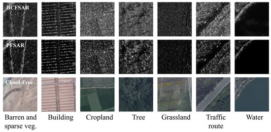 The entire dataset was manually labeled to classify the categories. The category that occupies more than 50% of the area in the image is designated as the label for that image based on visual discrimination, with the number of samples in each category listed in Table 4. The sample amount varies significantly across different scenes, ranging from 85 to 395 images. Overall, the proposed dataset contains a total of 2030 images across the seven categories. Additionally, Figure 4 presents sample images of typical regions from these seven categories, including BCFSAR images, PFSAR images, and cloud-free optical images.
