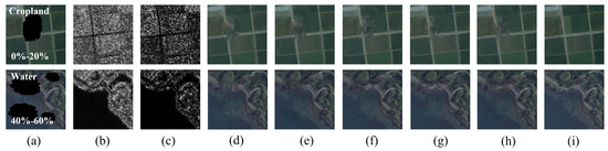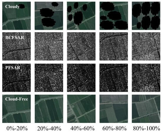 To evaluate the performance of image inpainting for missing regions of various sizes across different land types, masks with different cloud cover percentages were generated through random rotation or scaling transformations. The cloud cover ratios for each image were set at 0–20%, 20–40%, 40–60%, 60–80%, and 80–100%. Within each category, the cloud masks were randomly distributed in the same proportion and overlaid on cloud-free optical images to create simulated missing optical images. Figure 5 presents sample images of five different cloud cover percentages for the cropland category.
