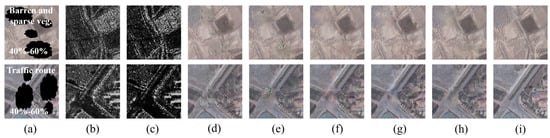 Figure 11a–h display the missing optical image, BCFSAR image, PFSAR image, reconstruction results from five baseline models, and the ground truth image. Table 12 provides the quantitative evaluation results.