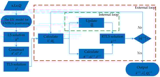 Figure 2 shows the implementation algorithm of the proposed RTLS estimator, named RTLS_Eqn. The proposed RTLS estimator can be achieved by the following two iterative loops: an internal loop to implement the re-weight operation and an external loop to implement the TLS estimator [39,42]. A detailed execution instruction of the proposed RTLS estimator is as follows: