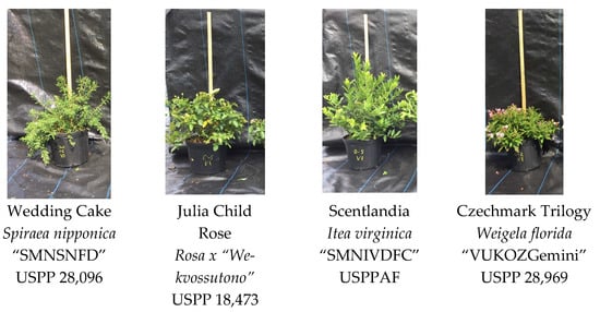 Table 1 provides detailed descriptions and measurements for four ornamental plant taxa used in the study: Weigela florida (“Czechmark Trilogy™”), Itea virginica (“Scentlandia®”), Spiraea nipponica (“Wedding Cake®”), and rose hybrid (“Julia Child™”). Each taxon was characterized by specific morphological traits, including average height, width, and substrate depth as well as qualitative descriptions of leaf structure, color, and overall plant form.